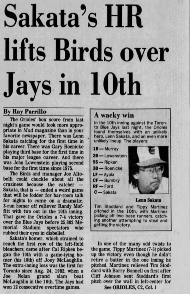 But when Cal Ripken blasted a solo home run to lead off the bottom of the tenth…it looked like Sakata might have to put the catcher’s gear on yet again.